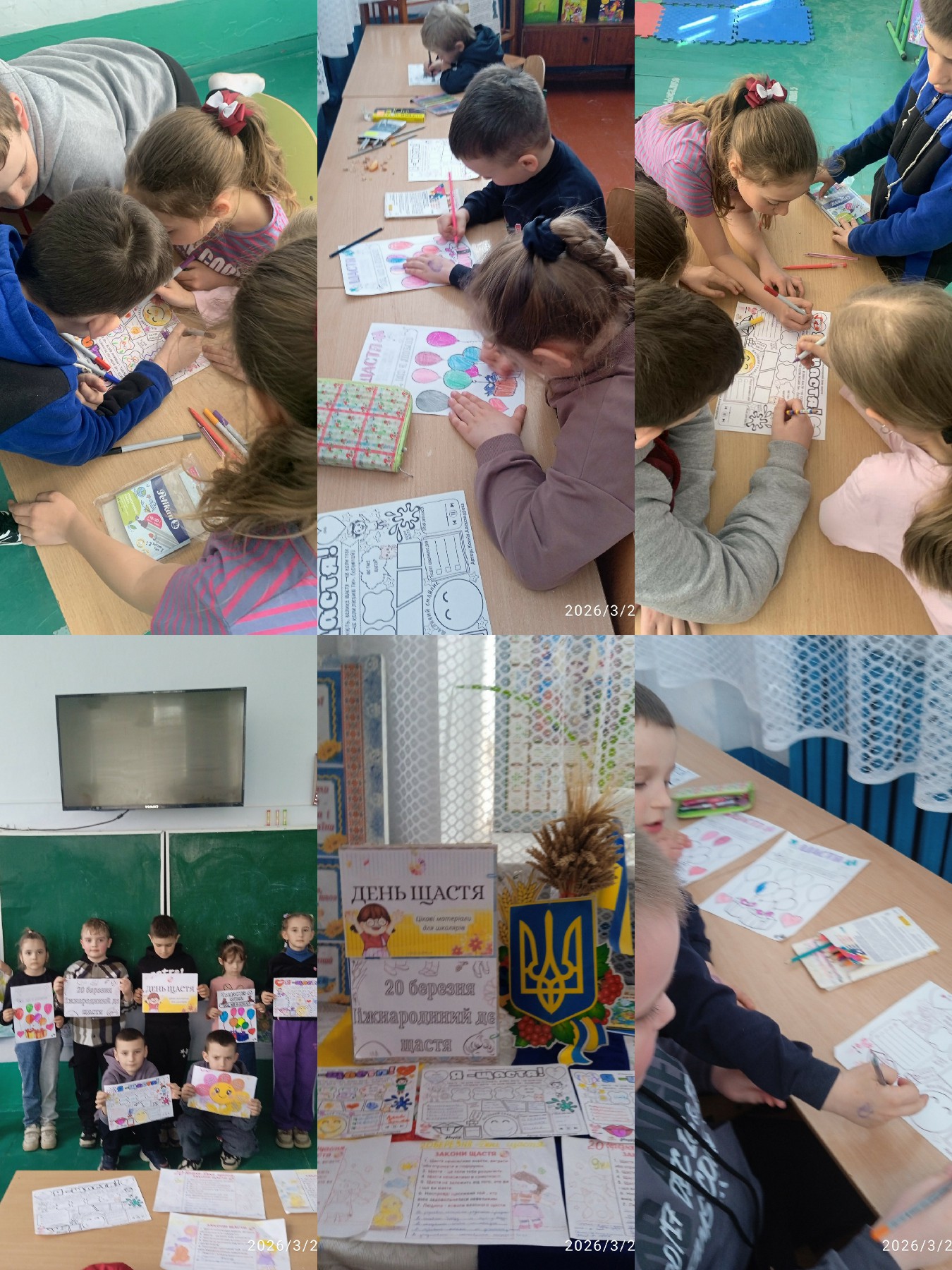 У цей день були задіяні усі класи. Учні 6-9 класів вивчали закони щастя та самостійно розмірковували над особистим щастям. Учні 3-5 класів долучились до "Щасливого смайлика". А наймолодші наші вихованці раділи розмальовкам "Я-Щастя". Усі роботи дуже яскраві та змістовні.